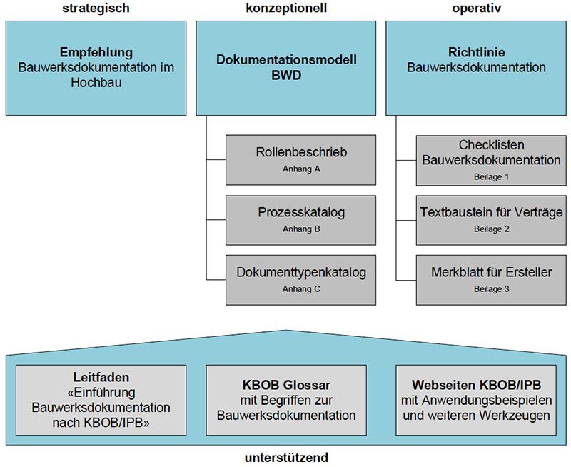 La KBOB e l'IPB, insieme ad altre associazioni professionali e parti interessate, hanno elaborato una raccomandazio-ne per la documentazione delle opere di costruzione nel settore delle costruzioni edilizie. Questa è stata resa disponibile in una prima versione nel luglio 2013. I documenti sono stati rivisti e aggiornati e sono ora disponibili per il download in una versione 2016.