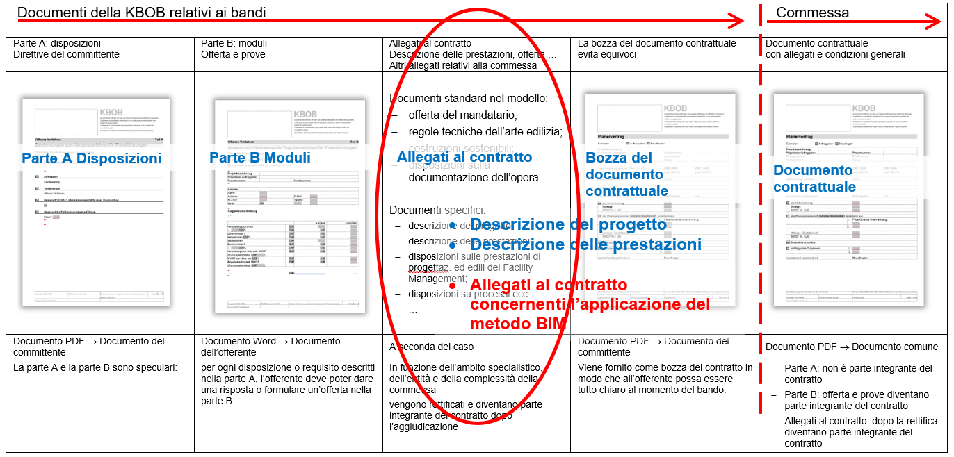 Il grafico è una rappresentazione in forma tabellare del panorama documentale KBOB lungo il processo di approvvigionamento. È importante includere l'uso del BIM come supplemento al contratto: contiene una descrizione di come le specifiche del progetto e la descrizione del servizio devono essere implementate utilizzando il metodo BIM.